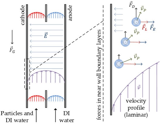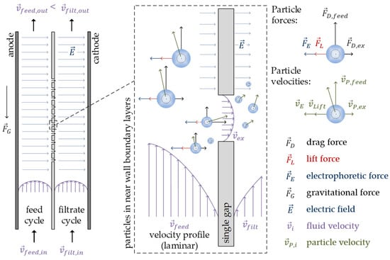 The forces acting on the particles in the near-wall boundary layer are shown in detail (Figure 2, right). The particles are transported by the flow, resulting in drag force . The locally acting velocity gradient in the laminar profile influences the particles by creating an asymmetric flow that results a wall shear-gradient induced lift force . The electric field exerts an electrophoretic force on the particles, resulting in the movement of a negatively charged particle towards the anode. By adjusting the differential pressure between the two channels, a volume of the suspension is transported through the gap into the filtrate channel, where particles from the near-wall boundary layer are collected. This flow rate is referred to as the exchange flow rate or the exchange velocity . The size of the particles in this boundary layer is directly related to the hydrodynamics and the charge, as well as the strength of the electric field.