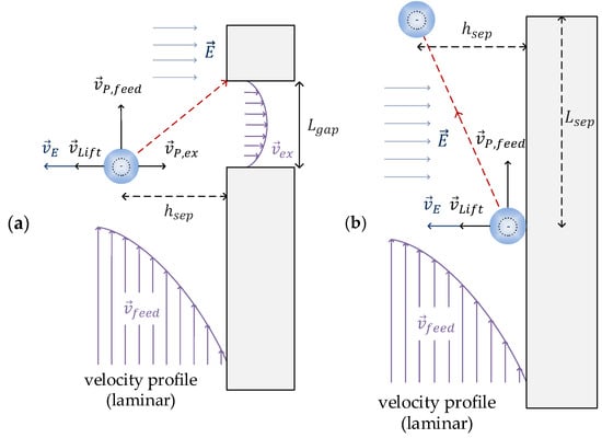 The above equation includes the horizontal velocity components due to electrophoresis (Equation (10)) and the lift force . In Figure 3, the theoretical separation is shown schematically for both parameters.