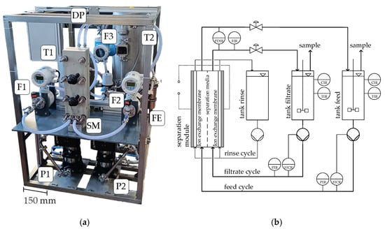 The main cycles, comprising the feed and filtrate, are designed almost identically to achieve a uniform flow rate. A centrifugal pump (Grundfos GmbH, Erkrath, Germany, CRE 3-5) (P1&P2) is situated below each tank (T1&T2) and is connected to a control circuit that includes one volume flow sensor (ABB Asea Brown Boveri Ltd., Zurich, Switzerland, ProcessMaster FEP 311) (F1&F2) each to ensure the process conditions. The filtrate outlet is additionally monitored by a flow rate sensor (Endress+Hauser Group Services AG, Reinach BL, Switzerland, Promag H) (F3), ensuring that the mass balance in the separation module is completely known. To each outlet of the separation module, manual membrane valves are attached to regulate the internal exchange flow rate. The total pressure of both main flows is measured before they enter into the separation module using BD sensors (BD|Sensors GmbH, Thierstein, Germany, DMP 331). In addition, the differential pressure (DP) between the outlets is recorded with BD sensors (DPT 100). Conductivity (Senseca Germany GmbH, Regenstauf, Germany, Greisinger GLMU 400MP) and temperature (PT100 sensor) are monitored inside the tanks. The process temperature is controlled via a cooling loop (Lauda Dr. R. Wobser GmbH & Co. Kg, Lauda-Königshofen, Germany, Proline RP855) in the filtrate tank. Two filter elements (FEs) with a pore size of 0.1 µm can be connected to the process for the pre- and post-cleaning of the system. The process data are recorded on a separate computer using the software Labview® 21.0, which enables the display and configuration of the process parameters online. Suspension samples are taken directly from the tanks and the PSDs are obtained by the static light scattered method (SLS, HORIBA Europe GmbH, Oberursel, Germany, Retsch Horiba LA-950).