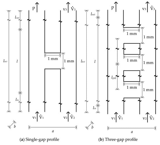 Scheme of the geometries used in the separation module of setup no. 1: (a) single-gap profile; (b) three-gap profile.