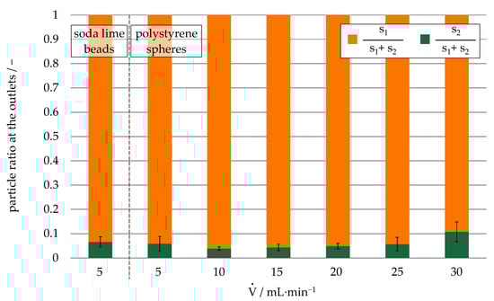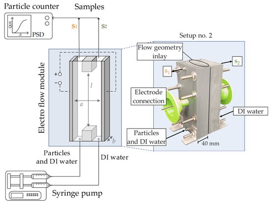 Figure 7 shows a process scheme with an image of the electro flow module, designated as setup no. 2. A syringe pump (Harvard Apparatus, Holliston, MA, USA, KD Scientific, KDS200) with two identical syringes provides a fluid volume of 30 mL for each inlet flow through tubes (Ø 1 mm). The flow rate is adjustable within the range of 5 to 30 mL∙min−1. The module itself consists of three main components: two identical PVC bases, each with an inlet, an outlet and an electrode; and one inlay with the geometric design and dimensions (cf. Table 3) of the rectangular flow channels, situated between the two setup parts. At the outlets, the flows are collected and subsequently measured with a particle counter (Markus Klotz GmbH, Bad Liebenzell, Germany, Abacus® mobil fluid touch). Sample s1 (orange) corresponds to the outlet located on the particle inlet side, and the opposite side is referred to as sample s2 (green). In this technical implementation, the electrodes function as the walls and are also connected to a laboratory power supply (Voltcraft®, Düsseldorf, Germany, PS405Pro).