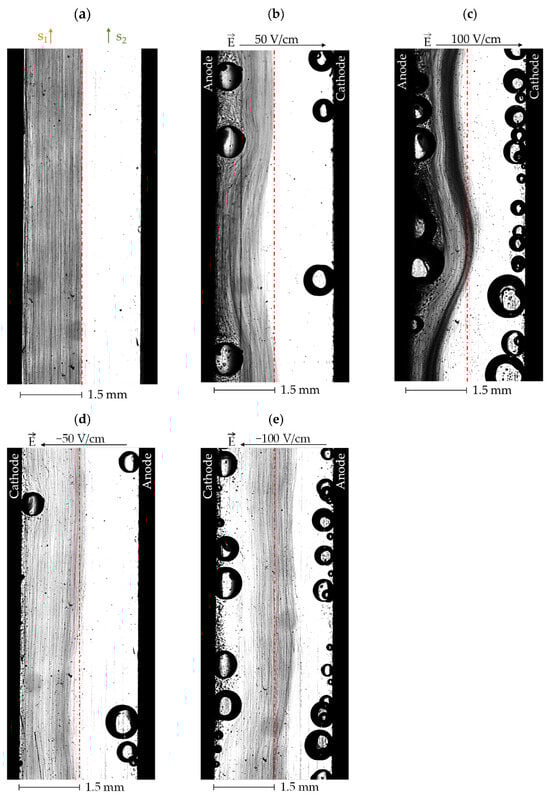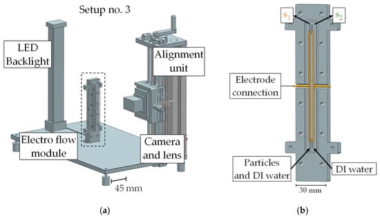 To access the module for optical measurement methods, the walls of the flow channel are produced from a transparent polymer (Dongguan Godsaid Technology Co., Ltd., Tangxia, Dongguan, China, RESIONE G217) via a 3D printing process (SLA, Elegoo Inc., Shenzhen, China, Saturn). Two stainless-steel plates are inserted into the manufactured module as electrodes and side wall boundaries, and the inlets and outlets are drilled. A transparent PMMA covers the module. To determine the particle movement in the module, a camera (Basler AG, Ahrensburg, Germany, Basler ace 2 R a2A3840-45ucBAS) equipped with a telecentric lens (1×) is used, with a resolution of 0.8 MP and a pixel size of 2 µm on a region of interest (ROI) of 7.7 mm × 4.3 mm. In combination with the optics and the parallelised light, the resolution of the physical and the image pixels is identical. With this chosen ROI, the entire channel width can be captured with 1500 pixels. Consequently, the size information of particles down to approximately 10 µm. can be obtained. A LED strip is used as a light source, providing backlighting. The camera system is mounted on a linear unit to enable capturing the entire channel geometry. The peripheral suppliers (syringe pump and power supply) are the same devices as in the previously described batch setup. Likewise, it is also possible to analyze the outlets with the extinction particle counter (Abacus® mobil fluid touch) to obtain a particle size distribution.