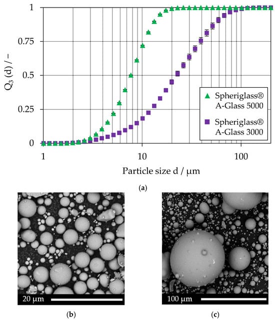 The soda lime beads (72.5% SiO2, 13.7% Na2O) from Potters Europe were used. The particle density was 2650 kg∙m−3, and the refraction index was 1.6. To ensure a broad range of particle sizes, different fractions (Potters Industries Inc., Malvern, PA, USA, Spheriglass® A-Glass 5000|3000) were selected, the distributions and SEM images of which are shown in Figure 9.