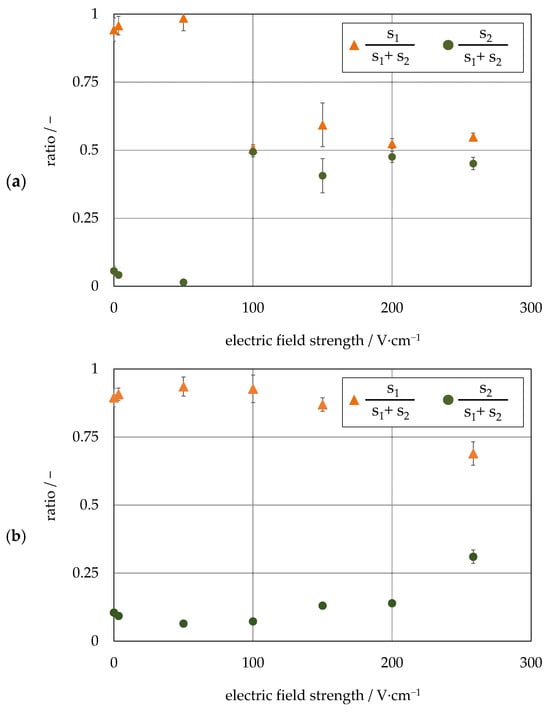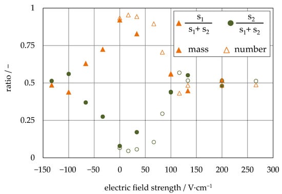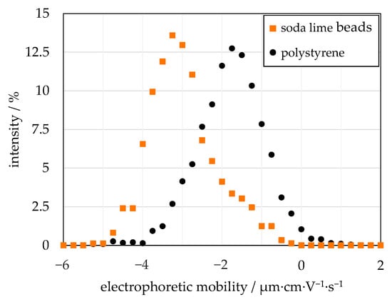 The superimposed homogeneous electrical field, generated by the addition of an external direct current (DC) circuit, results in the deflection of particles by an additional electrophoretic force , which is acting orthogonally to the main flow direction (Figure 2). The direction and magnitude of this force are dependent upon the electrochemical properties of the particles, particularly the electrophoretic mobility (EPM) [,,]. This coefficient represents a material parameter and can be measured using the Dynamic Light Scattering (DLS) method [,,]. Electrophoretic mobility is calculated as the ratio of particle velocity in an electrical field with an electric field strength .