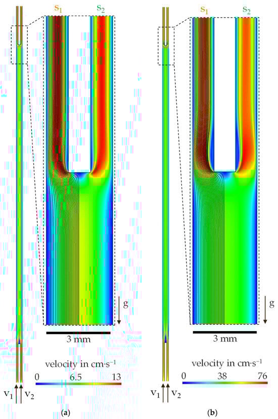 Lift force always acts perpendicular to the drag force, with the direction being contingent on the flow velocity around the particle, acting towards the higher relative velocity. With regard to the separation process, the wall-induced lift force is particularly relevant. At the wall, the fluid velocity is zero, resulting in a large velocity and shear gradient in the boundary layer. Conversely, at the centre of the main flow in the channel, the velocity gradient is reversed, thereby resulting in a reversed lift force []. The significant influence of the lift force on the particle trajectory within a Poiseuille flow (fully developed laminar flow) was demonstrated by Segré and Silberberg [,,]. Within the flow, the particles converge to an equilibrium radial position depending on the channel dimensions. This finding was subsequently validated by Ho and Leal [].