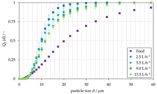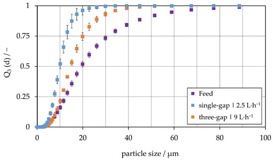 In order to conduct a comparative experiment, an operating point was set with a feed inlet flow rate of 237 L·h−1 within the processing range for the three gaps. This was then compared with the single-gap experiment at even inlet flow rates, at 216 L·h−1. For both experiments, the particle concentration was set to 3.75 g·L−1 and the process time was set to 120 min. At the conclusion of the test period, samples were obtained and a mass fraction was determined by drying the suspension. The analysis yielded a final mass concentration of approximately 15% of the feed concentration for the single-gap geometry. In the case of the three-gap geometry, this proportion is higher at approximately 25%. The effect of the scale-up can be achieved in this aspect; however, in further investigations, the separation must be evaluated. To analyze the separation, the PSD of the starting feed and the filtrate at the end were determined. These distributions are shown in Figure 22; for comparison, Table 5 also shows selected values from the experiments.