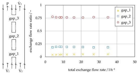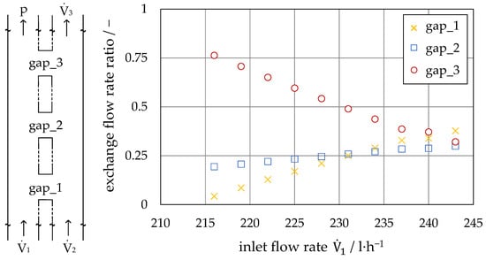 In consideration of the forces described, an analytical calculation of a separation with a single gap is carried out. The equilibrium of forces on a particle in the area above the gap can be calculated to determine the maximum wall distance directly in front of the gap that a particle must reach in order to be transported into the filtrate. This value in Equation (17) is representative of the separation height , as only particles with a smaller wall distance can penetrate the gap due to the drag force of the exchange flow. The bigger particles remain in the main flow due to lift and electrostatic forces. The separation is achieved when the residence time of the vertical and horizontal particle movement is equal; this is referred to as the separation time .
