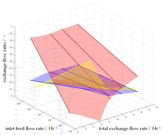 The single-gap profile is used in the separation medium as a model geometry. This has already been used in a preliminary work [] and is particularly suitable for analyzing the separation process and limits. The three-gap profile is utilized to investigate a scale-up approach by numbering-up. The main requirement in this case is to balance the internal flow rates to achieve homogeneous separation. This is sufficiently sophisticated in the three-gap geometry and increases as the number of gaps increases. The separation medium is made of a conductive material (stainless steel, σ ≈ 1.5 × 106 S∙m−1) to guarantee a homogeneous electric field. The thickness of the separation medium and the gap length are set at 1 mm in both cases, with the gaps extending across the entire depth. The dimensions are summarized in Table 2. The inlet and outlet areas, characterized by their lengths (; ) and depths (; ), provide the alignment and development of the flow profile. These are not influenced by the electric field and have no influence on the separation in the main separation area. The length (shown in Figure 5b) is the distance between the individual gaps within the multi-gap profile.