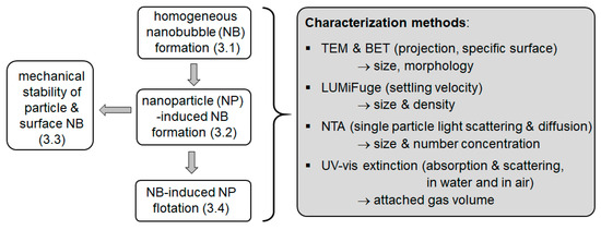 The different aspects of the study are shown schematically in Figure 1. The formation of the bubbles is performed in a gassing chamber. The bubbles form when the pressure is released either in the presence of NPs or without them. For the characterization, in situ techniques are employed on the suspensions (NTA, UV–vis extinction, analytical centrifugation) and offline methods are used on the dry powders (TEM, BET). In addition, the mechanical stability of the bubble–particle clusters was explored using ultrasonic treatment. Finally, the effects of the NBs on the flotation of NPs are considered.