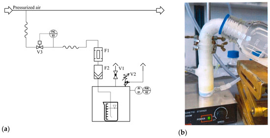 Experimental setup for (a) the production of NB and dissolved air flotation (DAF) and (b) for the froth flotation with a modified Hallimond tube. Piping and instrumentation diagram of the small-scale pressurization system (a): F1—activated carbon filter; F2—particle filter; V1—needle valve; V2—relief valve; V3—valve of the mass flow controller; PI—pressure indication (manometer); PIR—pressure indication recording; FIC—flow indication control; 01, 02, 03—numbering in the control and regulation unit.