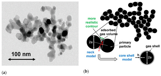 Morphology of NP aggregates: (a) TEM micrograph of a typical TiO2 aggregate (P 25) and (b) two models of the aggregate after gas treatment: the first model (neck model—for details, see Appendix B) seems more realistic but less accessible to light scattering calculations. Therefore, a simplified second model (core–shell model) is used for optical calculations (primary particle diameter: = 2a, shell thickness , cf. Appendix C).