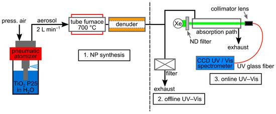 While the TiO2-NPs could be dispersed well and stably in pure water, producing a reference aerosol was somewhat more complex. The setup is shown in Figure 4. It comprises a nebulizer (ATM 210, Topas GmbH, Dresden; Germany), a drying section consisting of a tube furnace (12/38/400, Carbolite Gero, Neuhausen, Germany), a subsequent denuder (home-built), and the actual extinction unit. To achieve reliable comparability of the particles in the online measurement (aerosol extinction) with the offline analysis (suspension extinction), some of the atomized and dried aerosol particles were collected on a heated filter (Ø 150 mm, Hahnemühle, Germany) and then measured in the Agilent UV–vis spectrometer after redispersion.
