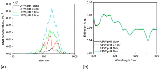 Influence of gas treatment pressure on the properties of free NBs: (a) on the size distribution measured with NTA; (b) on the UV–vis extinction.