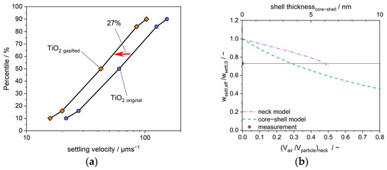 (a) Influence of the gas treatment of TiO2 aggregates on the settling behavior; (b) reduction in the settling velocity as a function of the attached air volume calculated for both models: core–shell (dashed line) and neck models (dashed–dotted line). The measured reduction in the settling velocity is also included; furthermore, the shell thickness is given to correspond to the core–shell case.