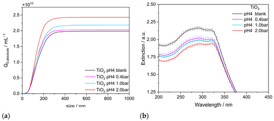 Influence of the gas treatment pressure on (a) the NTA and (b) the UV–vis extinction measurements for TiO2 aggregates (P25) in pure water.