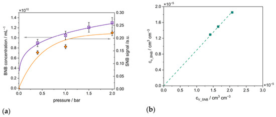 (a) Influence of the gas treatment pressure on the formation of new BNBs (given in terms of volumetric number concentration) and on the build-up of the air volume of SNBs to TiO2 aggregates; purple crossed rectangles: measured values with the standard deviation of the BNBs and the purple curve is a fit function, purple color refer to the left y-axis; orange dots: measured values with the standard deviation of the SNBs and the orange curve is a fit function, the orange color refer to the right y-axis (b) correlation between the volumes of BNBs and of SNBs confirming a causal relationship.