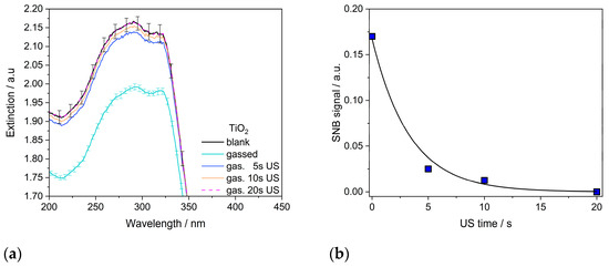 Influence of US treatment of gasified P25 aggregates: (a) changes in UV–vis extinction spectra with the standard deviation for the gas−treated sample (in light blue) and the blank sample (in black) (b) temporal evolution of the bubble–particle clusters with US time where gas-treated NPs return to their original state within 20 s by detaching adsorbed gas volumes.