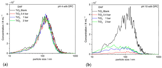 Number-based particle size distributions obtained with NTA measurements of the particles remaining in the suspension DAF after gas treatment at different pressures: (a) for TiO2 NP aggregates at various gas treatments at pH 4; (b) for TiO2 NP aggregates at various gas treatments at pH 10.