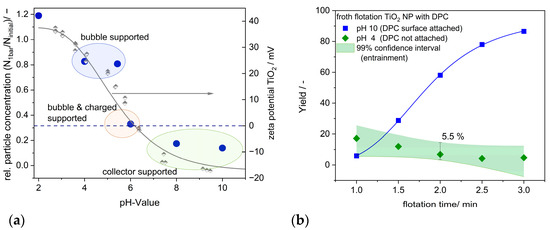 (a) Changes in the TiO2 NP concentration N1bar/Ninitial due to gas treatment of the suspension at 1 bar at different pH values analyzed by NTA (blue dots refer to the left y-axis). The suspension was pre-mixed with a cationic collector (DPC) before being treated with gas. The zeta potential curve for TiO2 NPs was analyzed without the presence of any additional collector or salt (gray semi−filled diamonds and the gray line refer to the right y-axis). (b) The time-dependent yield of TiO2 NPs with DPC as a collector by froth flotation using a Hallimond tube. Blue squares: flotation at pH 10, green diamonds: flotation at pH 4; green area: 99% confidence interval, defined as entrainment (false flotation) with an averaged standard deviation of 5.5%.