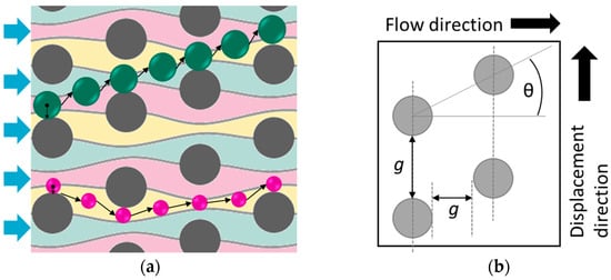 The DLD method consists of an array with periodically arranged micropillars as shown schematically in Figure 1. It displaces particles larger than the so-called critical diameter along the tilt direction perpendicular to the flow direction, whereas smaller particles pass through the array in the so-called mixed motion without being displaced [2]. In detail, the flow between adjacent posts is subdivided into a number of streamlines defined by the periodicity of the array, as illustrated in Figure 1 [2]. Particles with a radius larger than the first streamline will bump against the post and thus the center of the particle will change the streamline, resulting in a displaced trajectory [2]. Smaller particles will follow the streamline in a zig-zag motion [2]. In addition, partial displacement will occur, depending on the particle concentration, array geometry, and flow rate [2]. This motion describes the trajectory of a particle that is partially displaced by not changing the streamline after each post or changing randomly between displacement and zig-zag motion [2]. For low Reynolds numbers (Re), the critical diameter (Dc) can be approximated by Equation (1). For higher throughput up to Re = 70, Equation (2) can be used to calculate Dc by taking the gap g and the tilt angle θ, as well as the Reynolds number, into account [2,3].