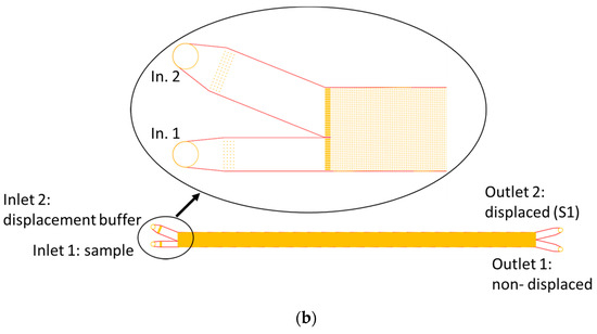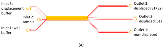 For experimental investigations, two different DLD designs were used. Both were optimized for high throughput and one was specifically adapted for high particle concentration, as shown in Figure 2a,b. The main design parameters are listed in Table 1. Design 1 consisted of 2 segments in a chirped arrangement with a constant gap of 23 µm and a varying tilt angle (3° and 7°). It had three outlets: one for each segment and one for the non-displaced sample. In this design, the gap was independent of the segments to avoid the effects of changing particle velocity due to gap size differences. As shown in Figure 2a, three inlets were used to prevent particles from interfering with the sidewalls. At low flow rates, according to Equation (1), the critical diameter is 8 µm for the first segment and 11 µm for the second segment.