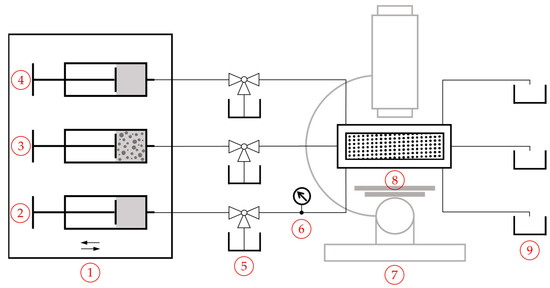 Experimental setup of design 1: (1) Cetoni Nemesys pump system (Cetoni GmbH, Korbussen, Germany) with three medium pressure modules, placed on a tumbling shaker plate (VWR, Radnor, PA, USA); (2) stainless steel syringe, containing buffer 1; (3) stainless steel syringe, containing feed particle suspension; (4) stainless steel syringe, containing buffer 2; (5) Three-way ball valves to refill the syringe pumps from storage container; (6) pressure monitor; (7) Zeiss Axio Observer inverted microscope (Zeiss, Göttingen, Germany) with a 10× lens and a 1.6× photo adapter under darkfield illumination; (8) microsystem, fixed using a CNC-machined PEEK holder with sealing rings and an aluminum lid for fixation; (9) collection containers for the separated particle fraction suspensions.
