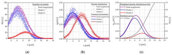 An example of the particle size number distributions is shown in Figure 4a. It consists of individual measurements of the diluted sample suspension as well as the two outlet suspensions (fine-outlet 1; coarse-outlet 2) from design 2. It should be noted that the particle measurement range of the instrument is 3–20 µm [25]. The particle number density distributions q0,x,i were calculated using Equation (5):