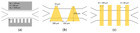 The DEP designs in the experiments focused on cDEP, continuous dielectrophoresis, in which the electrodes create an asymmetric electric field perpendicular to the flow direction, which is then used to displace the particles within the channel. Three different electrode designs were used in the experiments, based on existing publications, as shown in Figure 5 with their main geometrical properties used here [27,28,29]. In the first design, 3D stainless steel electrodes, as depicted in Figure 5a, were placed on the sides of a straight microfluidic glass channel without contacting the fluid, since this setup was reported to generate the best electric field strength [29]. The second and third design approaches focused on the electrode at the top side of the channels to simplify the manufacturing process for the combined design. Design 2 consisted of trapezoidal electrodes, as depicted in Figure 5b. Design 3 is based on interdigitated electrodes, which are mainly used for an inhomogeneous field distribution along the channel height. This is the only design where the electric field distribution can be calculated manually [16,27]. The measurements of this design are given in Figure 5c. To test the effect of different height distances between the electrodes and the channel, in the first approach, the electrodes were placed at a distance of 200 µm to the main channel by using the top side of a glass cover. In the second approach, the electrodes were placed at a distance of roughly 20 µm to the fluid, using a PDMS cover layer between the electrodes and the fluid, as illustrated in a cross-sectional view in Figure 6.