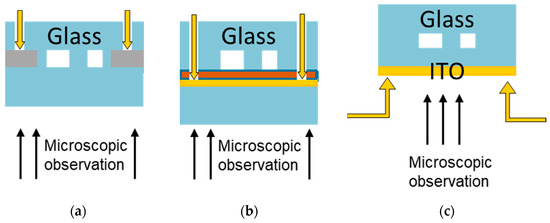 Schematic cross-sectional view of the setups testing different distances between the electrodes and the fluid. The yellow arrows illustrate the electrical contact using spring-loaded contacts for the electrodes. (a) Stainless steel electrodes were inserted next to the microfluidic channel. Due to the fs-Laser manufacturing process, a minimal distance from around 200 µm could be achieved. (b) To minimize the distance between the semi-transparent ITO electrodes and the microfluidic glass channel, a thin PDMS layer (depicted in orange) was deposited as a sealing layer. Thereby, a minimal distance from around 20 µm was achieved. (c) The electrode was deposited on top of a sealing glass wafer (height: 200 µm). This process was most compatible to all other processes, since the deposition and structuring of the ITO electrode layer were the last steps in manufacturing. All combined systems were manufactured by this way; the microchannels were manufactured from silicon instead of glass.