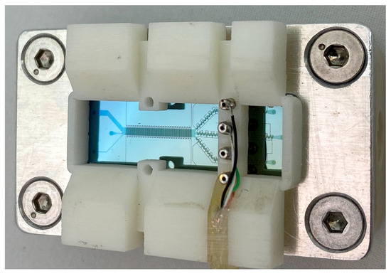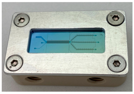 The combined arrays consisted of a silicon DLD array (design 1, Section 2.1.1) that was etched to a height of 50 µm by reducing the number of cycles in the Bosch process to 53. The remaining fabrication steps were identical to the standard DLD arrays, with the exception that a glass wafer at a thickness of 0.2 mm was anodically bonded to the DLD arrays. On top of the glass cover, the ITO electrode layer was deposited and patterned by fs-laser ablation. Both DEP designs (design 2 and 3, Figure 5b,c) were applied to the combined systems. A combined system-on-a-chip mounted on a holder is shown in Figure 7.