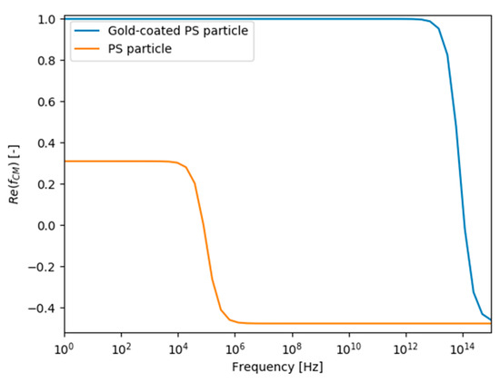Dielectrophoresis describes the force generated by an inhomogeneous electrical field on a non-conductive particle [16]. By partial polarization of the particles and the surrounding medium, a gradient is generated, depending on the electrical permittivity of the particle and the buffer. Depending on the difference, a force towards the field maxima is generated, named positive dielectrophoresis (pDEP) [16]. The contrary behavior if the particle moves towards the field minimum is called negative dielectrophoresis (nDEP) [16]. The generated force can be calculated according to Equation (3) by using the particle radius (a), the permittivity of the particle (εp) and of the medium (εm), the electric field gradient (), and the real part of the Clausius–Mossotti factor (Re[fCM]). The values for the real part of this factor are in the range of −0.5 to 1 [16]. The Clausius–Mossotti factor can be calculated by Equation (4), where the complex numbers are marked by an asterisk. The permittivity depends on the conductivity (σ) and frequency (ω) according to ε* = ε − iσ/ω [16,17]. Thus, by changing the frequency, the mechanism can be tuned for different materials. To generate an inhomogeneous electrical field, different methods can be applied, either by insulators within the channel (iDEP), or by side or top electrodes (eDEP) for continuous or batch processing [18]. If the electrodes are not in contact with the buffer medium, the setup is called contactless dielectrophoresis (cDEP) [16].