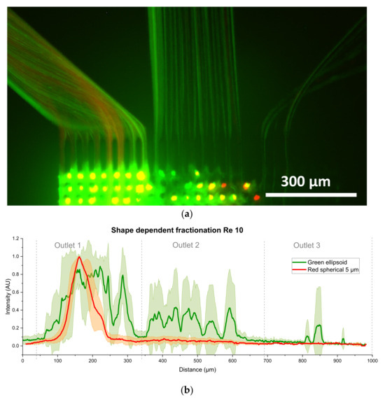 In addition, other particle properties such as particle shape and density have been investigated within the DLD [2,8,9,10]. Particle mixtures at different densities were investigated using T-shaped posts, resulting in a smaller gap at the bottom and a larger gap at the top of the array. This array was designed in a mirrored way so that displaced particles were concentrated towards the center of the array [10]. With this setup, material-dependent fractionation (polystyrene from silica) could be achieved [10]. At Stokes flow, density has a neglectable effect on the displacement when using posts with straight vertical sidewalls. As the flow rate increases, the inertial effects also increase. In the inertial regime of flow, effects caused by density on the particle trajectory increase [8,9]. Simulative investigations have shown that density-dependent fractionation is possible with an increased Reynolds number under certain geometric conditions [8]. Besides density, the fractionation based on particle shape and deformability has also been investigated inside a DLD [2,11]. For investigating non-spherical particles, the largest and smallest dimension can be used to define the effective diameter in all spatial directions. The easiest way to force particles along one axis is to adjust the height of the array to be smaller than the largest effective diameter [2,11,12]. In this way, red blood cells and trypanosomes as well as bacteria at different chain lengths could be separated in low-flow applications [2,11,12]. Another method, suitable for a high-throughput application, would be to use hydrodynamic forces in the inertial regime to align particles according to their smallest dimension along the channel height (z-axis) to achieve a vertical fractionation [13]. However, there has been no experimental investigation of elliptical particles at throughputs above Stokes flow.
