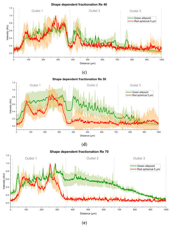 The particle shape and density experiments were performed using design 1 with three inlets. To prevent the redistribution of particles in the DLD array during syringe refilling, the particle suspension was always disconnected from the system after a waiting time of 5 min. to allow for pressure compensation inside the DLD. As buffer, filtered demineralized water was used without any surfactants (filter pore size: 0.2 mm). Different binary suspensions containing fluorescent red and green particles were used as sample solutions to facilitate differentiation. The suspensions were prepared from fluorescent red melamine particles (microparticles GmbH, Berlin, Germany) and green polystyrene particles from Thermo Fisher (FluoroMax Green particles, Thermo Fisher, Schwerte, Germany), as well as elliptical elongated green polystyrene particles provided by Laura Weirauch, University of Bremen. The particle size combinations within the sample suspensions for each experiment and the corresponding Reynolds numbers are listed in Table 3.