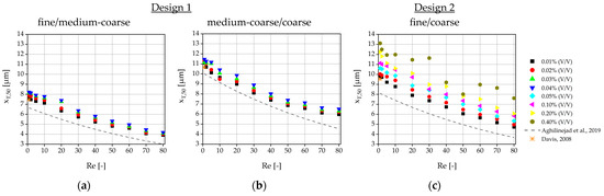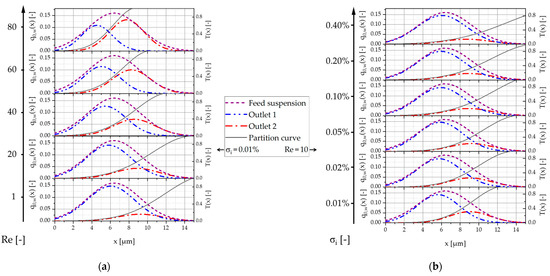 where Nx,i is the respective number of particles of particle size x in sample i, Ntotal,i is the total number of particles in the sample, and Δx is the selected interval width of the histogram (in this case Δx = 0.0125 µm). Gaussian functions were determined to approximate the density functions (Figure 4b). In the next step, the particle number density distributions q0,x,i were weighted by multiplying q0,x,g with the coarse material fraction g and q0,x,f with the fine material fraction f (Figure 4c). In the case of design 1 with three outlets, q0,x,m was additionally multiplied with the medium material fraction m. The coarse material fraction g, defined as the ratio of the coarse material flow to the feed material flow , was calculated according to Equation (6):