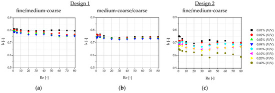 as also depicted in Figure 4c. It indicates what proportion of the feed material fraction (as a function of the particle size) is contained in the coarse material after separation. Therefore, the steeper the degree of separation curve, the sharper the separation. The quantiles xT,25, xT,50, and xT,75 were determined from the partition curve using linear interpolation with MATLAB 2022a. The value xT,50 was defined as the separation size/Dc (median/preparative separation size). The separation efficiency κ (according to Eder) was defined as the quotient of the quantiles xT,25 and xT,75, which is a measure of the sharpness of the separation [26].