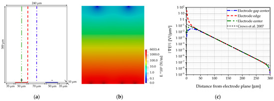 Results of the calculation of the inhomogeneous E-field of an interdigitated electrode DEP microarray section using the FVM: (a) schematic of the simulation domain, showing the location of the lateral electrode pair; (b) the color diagram shows the distribution of the electric field in the simulation domain; (c) electric field gradient square at three different perpendicular lines to the channel (depicted in (a)) and comparison with the model for the gradient term according to Crews et al. [54].