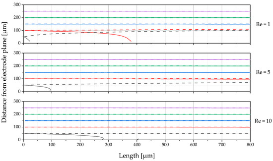 Figure 21 shows the particle trajectories over the length of the passed DEP channel for three different Reynolds numbers (based on the DLD section). As can be seen in Figure 21, most of the particles that were introduced in the section of the channel near the electrode level are deflected. Here, the gold-coated PS particles (solid lines) were deflected in the direction of the electrode plane (pDEP). In contrast, the uncoated PS particles (dashed lines) were slightly deflected in the opposite direction (nDEP). This occurs earliest at the lowest Reynolds number tested, Re = 1, for the two particles initiated furthest from the electrode wall. At a Reynolds number of 5 and 10, the gold-coated PS particle nearest to the electrodes is also completely deflected. As expected, the distance travelled in the main flow direction increases with the Reynolds number until complete separation occurs. The particle second closest to the electrode wall is expected to be fully deflected along the entire length of the channel at a Reynolds number of Re = 5; at Re = 10 the channel length is probably not sufficient. The trajectories of the uncoated PS particles experiencing nDEP approach a line that is not expected to extend beyond the center of the channel.