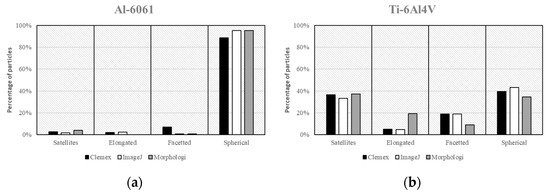 The key finding of this study is that the three systems used—two employing metallographic cross-sections and one utilizing particle shadow projections—yielded similar classification results with the four selected additive manufacturing (AM)-type metal powders. Classification of particles with satellites using a corrected extent ratio demonstrated high consistency across all three systems. Similarly, the classification of elongated particles using the ellipse ratio showed consistent results, although there were slight variations with one of the powders (Ti6Al4V) when using automated systems.