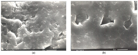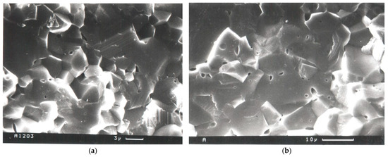 The SEM image of the fracture surface of ceramics produced at a temperature of 1550 °C (Table 1, sample 4) demonstrated predominantly intergranular fractures, since crystallite facets are clearly visible (Figure 1a). This material with a grain size of about 6.6 µm (Figure 1a) has fine intracrystalline closed porosity and coarse interparticle porosity inside. Increasing the hot-pressing temperature up to 1720 °C (Table 1, sample 8) results in an increase in grain size up to 21.9 µm in full-density aluminas with fine intracrystalline closed porosity inside the samples (Figure 1b). The presence of chipped areas on the fracture surface of such a material indicates transgranular failure and transgranular crack propagation (Figure 1b).
