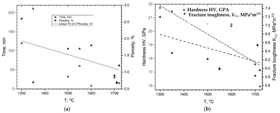 Porosity (a) and hardness and fracture toughness (b) vs. the hot-pressing temperature. The dwell time was chosen randomly.
