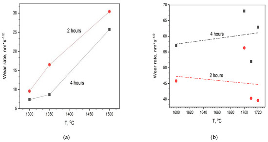 The wear rate of alumina ceramics vs. the temperature of hot-pressing: (a) 1300–1500 °C; (b) 1600–1720 °C. The time of testing was 2–4 h.