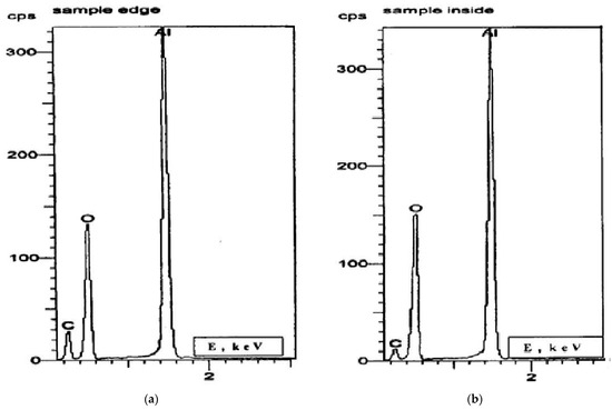 The element distribution of the alumina ceramics (Table 1, sample 1): (a) the edge; (b) inside.