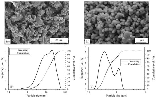 Scanning electron microscope observations and particle size distribution of the (a,b) stainless steel powder, and (c,d) alumina powder.