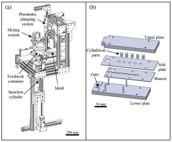 Injection setup showing (a) the molding press, and (b) an exploded view of the mold cavity used to produce cylindrical green parts.