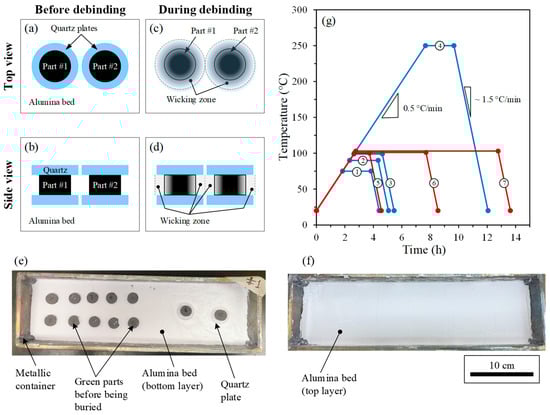 Illustration of the debinding setup with two green parts sandwiched between quartz plates (a,b) before debinding and (c,d) during debinding from the top and side views, (e) green parts deposited on quartz in an alumina bed and a metallic container, (f) parts buried in alumina, and (g) schematic representation of the debinding cycles.