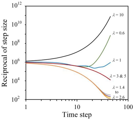 For the wicking computational domain, a pore size distribution index of = 0.74 was adopted, based on mercury intrusion porosimetry (MIP) measurements reported by Somasundram et al. []. However, for the injected green part, this MIP approach cannot be applied since its pore network was filled with binder, preventing MIP infiltration. Consequently, the pore size distribution index for this second computational domain () was estimated through a parametric numerical study, guided by values reported in the literature for similar systems. To assess the impact of , a series of numerical simulations were conducted with values ranging from 0.6 to 10, and the step size reciprocal was plotted for all time steps (Figure 4). A high step size reciprocal (meaning a small time step) designates an unstable simulation, where the solver must reduce its step to maintain convergence. Conversely, a low step size reciprocal implies a large time step, leading to a stable simulation and faster computation. In Figure 4, convergence is indicated by the formation of a plateau, signifying that the solution reaches a numerically acceptable equilibrium (even at a non-zero but sufficiently small value of the residual). At low values (e.g., 0.6 or 1), the solver initially converges, but becomes rapidly unstable and diverges. Physically, such a low value corresponds to excessive capillary pressures, leading to unrealistic fluid velocities. For intermediate values (i.e., 1.4 ≤ ≤ 2.6), the debinding model converges rapidly and remains stable. These values offer a realistic balance between capillarity and permeability, resulting in a gradual and physically consistent evolution of binder saturation. On the other hand, higher values (e.g., 3 and 5) exhibit slower convergence, while = 10 causes the simulation to diverge immediately. This behavior reflects a loss of capillary efficiency, where a narrow pore size distribution leads to insufficient capillary pressure and thus, an immobile binder, contradicting with experimental observations. In light of these results, four intermediate pore size distribution index values between 1.4 and 2.6 were selected to study the influence of the binder distribution in both computational domains.