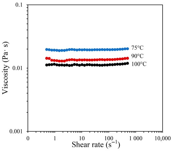 The binder viscosity was determined using the feedstock viscosity profiles presented in Figure 5, which were obtained at 75, 90, and 100 °C using a rotational rheometer (Anton Paar MCR 302, Montreal, QC, Canada). A concentric-cylinder cell (CC-17), coupled with a Peltier temperature-controlled measuring system (C-PTD 200, Montreal, QC, Canada), was employed to apply shear deformation rates ranging from 0.5 to 500 s−1. The temperature of approximately 100 °C represents the maximum temperature before excessive binder evaporation is observed during testing. Therefore, a mean viscosity value of 0.011 Pa·s, extracted from Figure 5, was used as the binder viscosity at the debinding temperature (250 °C) in the simulations.