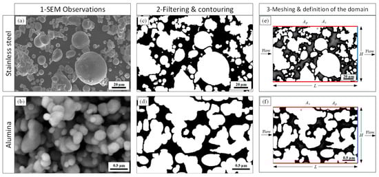 Steps required to assess the permeability and capillary pressure in the computational domains: (a,b) SEM observations of the stainless steel and alumina powders, (c,d) filtering and contouring using Fiji, (e,f) meshing of the porosity zones and definition of the domains.