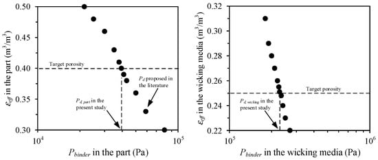 The minimum capillary pressure () for each domain (i.e., the part or the wicking medium) was assessed using a pore-scale model in COMSOL. As reported in Figure 7, this was achieved by varying the binder capillary pressure in each domain () and numerically calculating the resulting effective porosity () within the porous domain using the following relation: