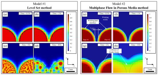 Figure 8 illustrates the spatio-temporal evolution of binder saturation in two neighboring parts and its migration into the wicking medium for a debinding at 100 °C using two different numerical models. Exploiting the symmetry of the numerical domain, parts #1 and #2 (separated by 2 mm) are represented as quarter sections embedded within the wicking medium. The interface between them is indicated by the black line in Figure 8. Since the permeability of the wicking agent is lower than that of the green parts (i.e., its finer pores generate higher capillary suction), the liquid binder is radially extracted from the coarser pores of the green parts into the finer pores of the wicking agent under capillary pressure. Simultaneously, argon gas flows in to displace the binder and escapes through the wicking pore network. In this top view representation of the debinding model, the binder extraction occurs along the x-y 2D plane (consistent with the experimental setup shown in Figure 3a–d and described by Darcy’s law), where the binder velocity is proportional to the capillary pressure gradient and the permeability of the part, and inversely proportional to the binder viscosity.